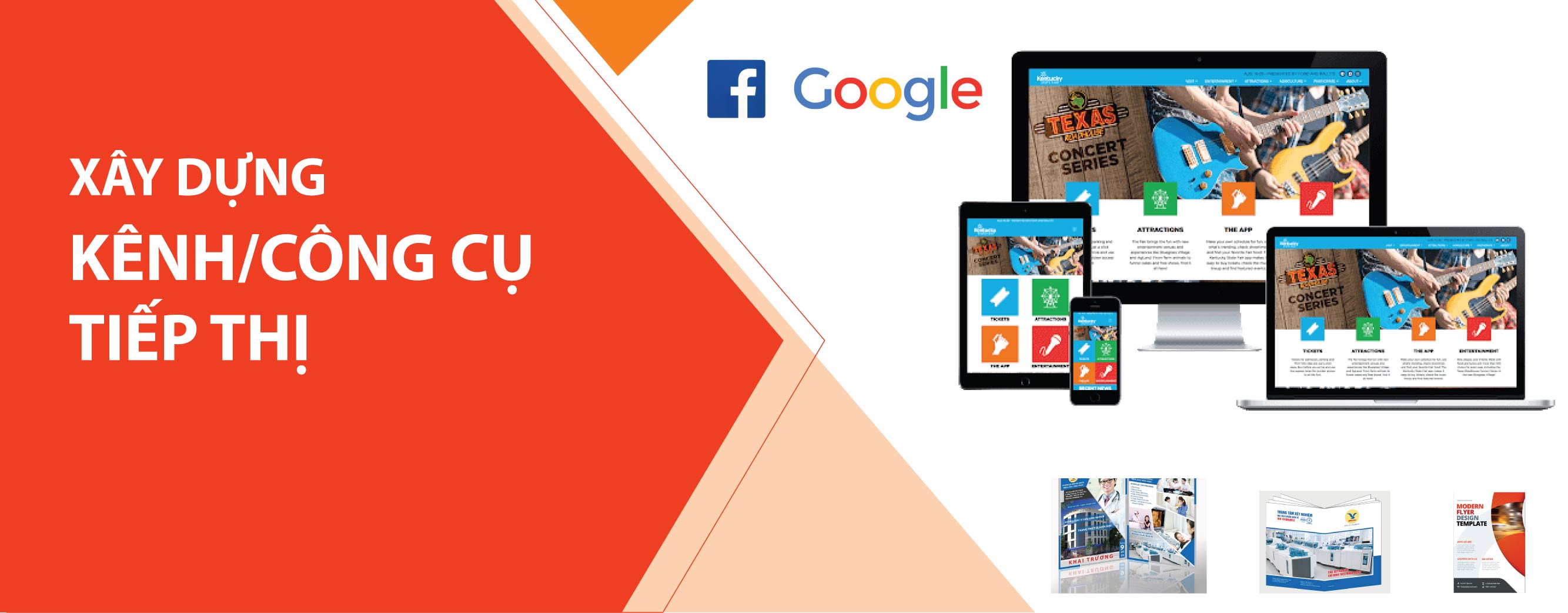 Xây dựng hệ thống kênh, công cụ tiếp thị như website, fanpage, kênh youtube; viết nội dung, thiết kế, thi công ấn phẩm truyền thông tiếp thị như: tờ rơi, catalogue, poster, phim giới thiệu dịch vụ,…